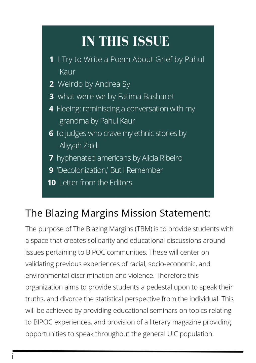 focused on providing UIC's BIPOC communities a space for solidarity and educational discussions through seminars, events, and a literary magazine
